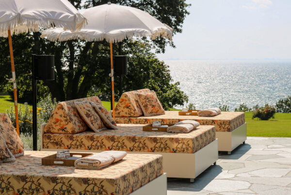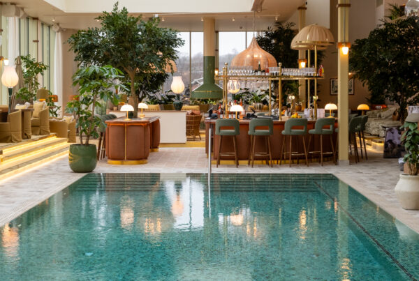 Coco Beach Club is a tribute to rattan, straw, and other natural materials. This stands in contrast to soft velvet upholstery, brass, and crystal chandeliers. Coco Beach Club is a different experience compared to Palmer’s but to give a sense of cohesion for the whole hotel, the 60s can still be felt, for example in the patterns on the tiles in the pool area. The color palette for Coco Beach Club is soft with shades of pink, green, light blue, and yellow.